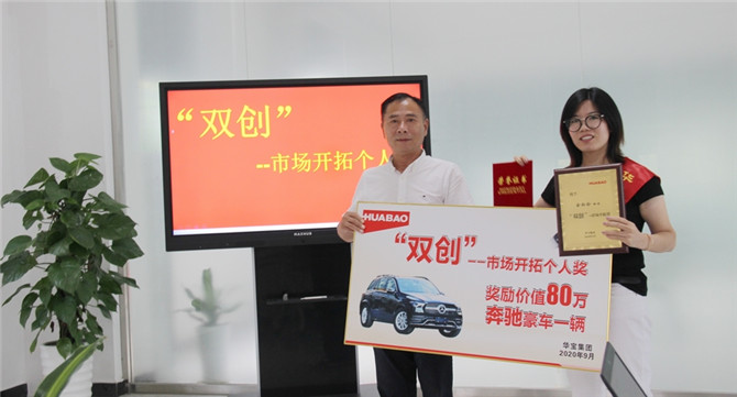 2020年9月29日,“雙創”--市場開拓個人獎授車儀式在華寶集團隆重舉行。分管外貿的俞玲玲女士以突出的銷售業績獲此殊榮,獎勵價值80萬的奔馳豪車一輛。